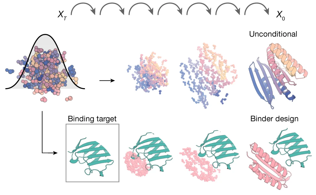 Using RFDiffusion model to predict > 80 amino acid binding partner. Candidate binding structure, amino acid selection and weighting, together with diffusion model parameters allowed for generation of a binding partner backbone structure.